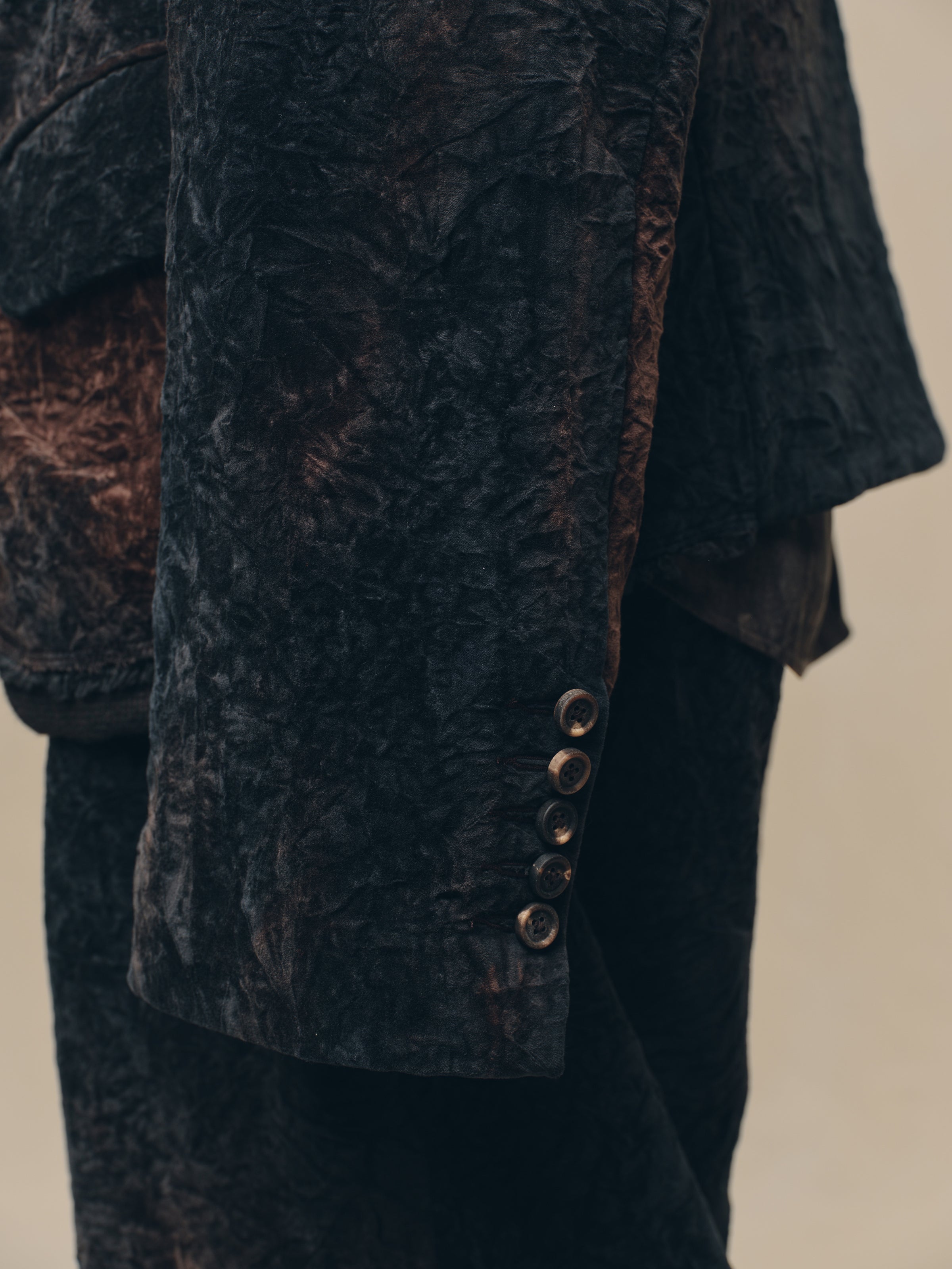 * THREE BUTTON CLOSURE WITH FOLDING DETAIL.
